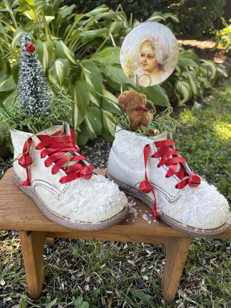 Vintage decorated baby shoes. Each embellished with seasonal decor and photo holder. Perfect for new parents and grandparents.