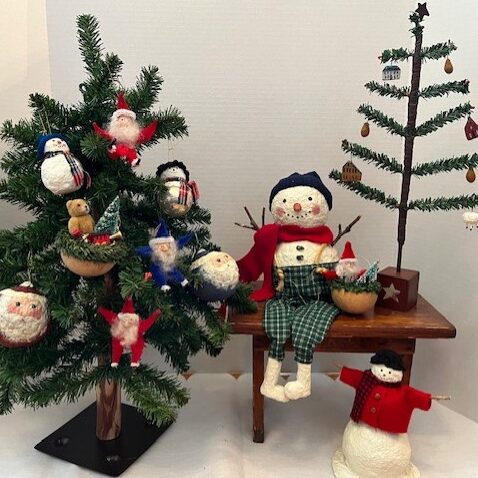 Christmas ornaments, Santas and snowmen made from paper clay and mixed media